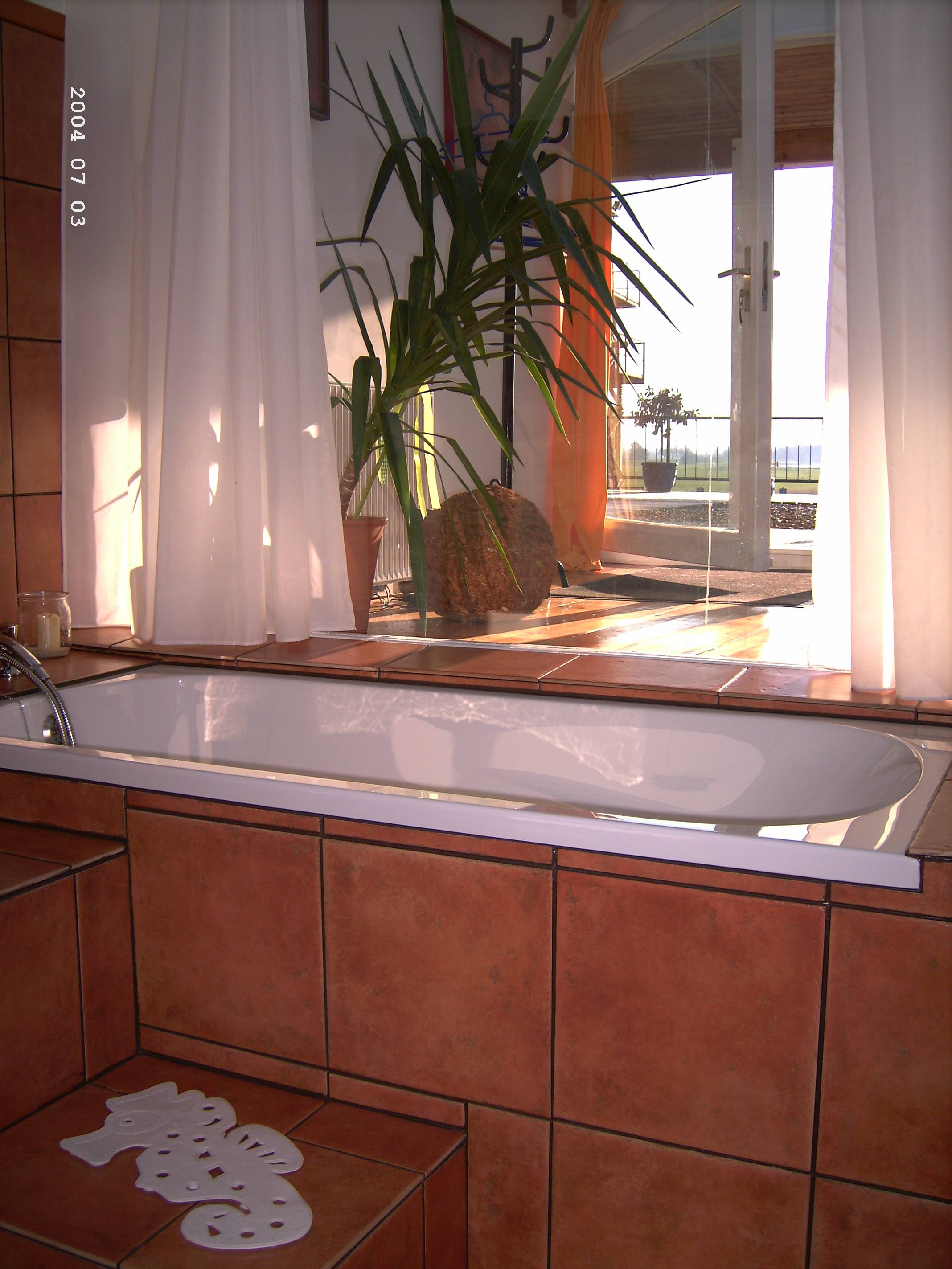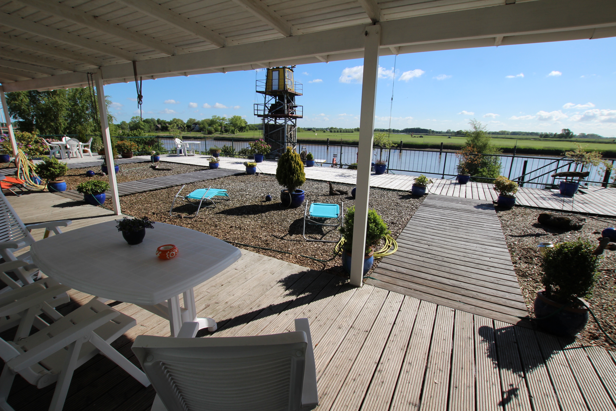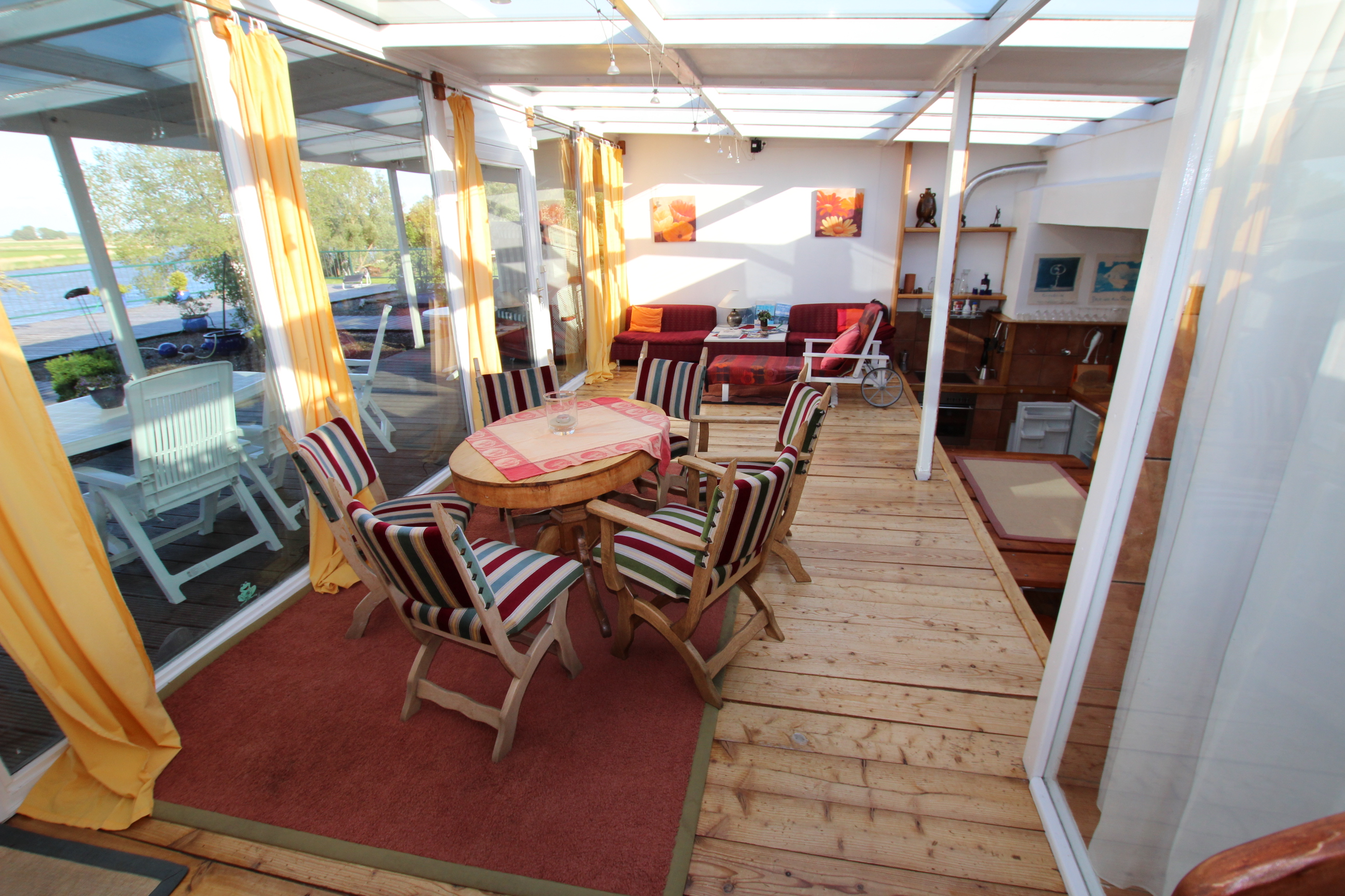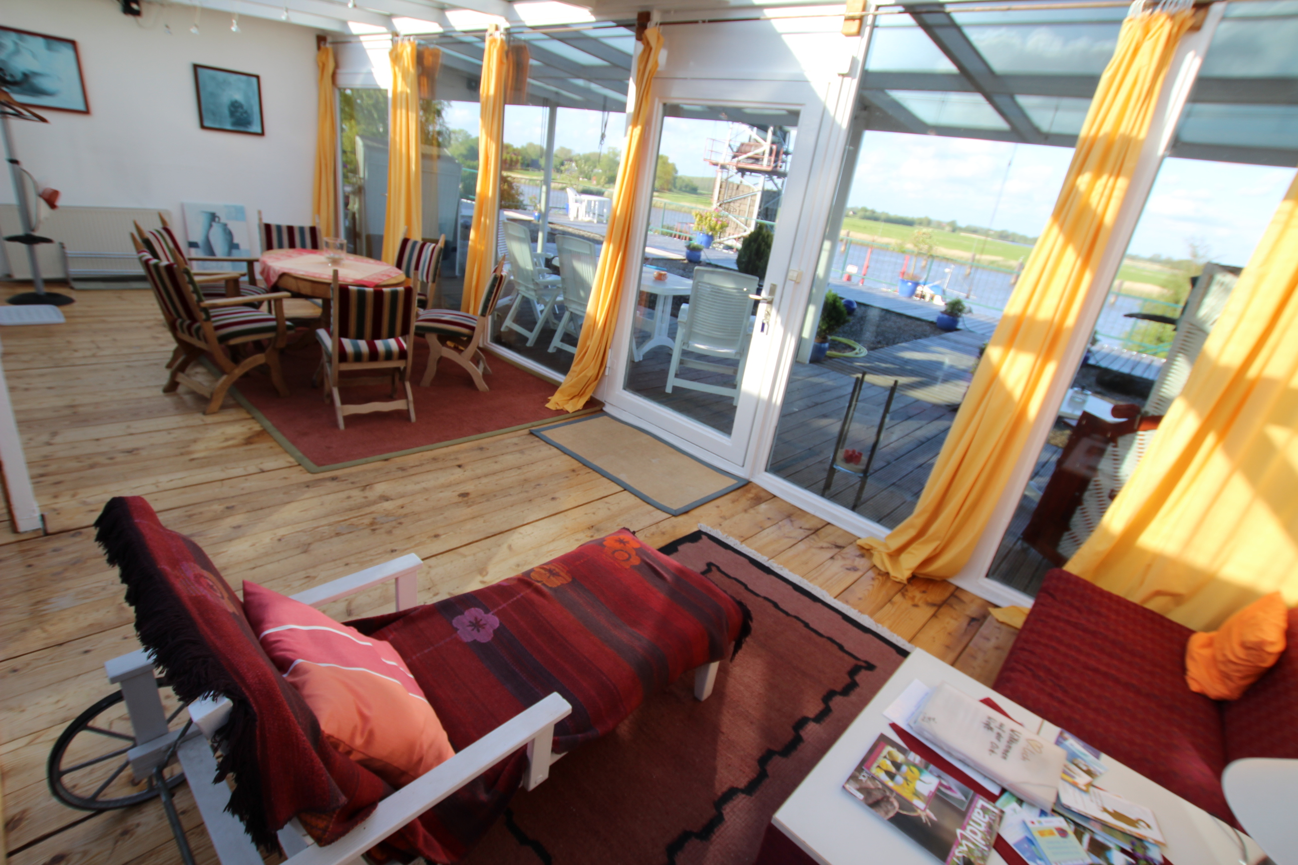 Der Zugang erfolgt über die Dachterrasse. Direkt vor dem Wohnungseingang befindet sich die überdachte Terrasse, die mit Gartenmöbeln für Sie ausgestattet ist. Die Wohnung selbst ist in zwei Ebenen unterteilt. Die obere Ebene ist eine Art Wintergarten mit einer Essgruppe und einer gemütlichen Sitzecke, die zum Verweilen einladen um den Blick über das Wasser und die Marschlandschaft zu genießen. Im unteren Bereich befindet sich die offene Küche mit integrierter Bar und ein großräumiger Wohn- und Essraum mit Stereoanlage und Fernseher. Die Küche ist für 6 Personen modern mit Mikrowelle, Ceranfeldkocher, Ofen und Geschirr ausgestattet. Im hinteren Bereich sind die Zugänge für die beiden Doppelzimmer, die in sonnigen Farben ausgestaltet sind. Im Wohnraum befindet sich ein bequemes französisches Bett. Die gesamte Wohnung ist liebevoll eingerichtet und verfügt über schöne Details. Das Schönste an der Wohnung ist der Ausblick und das Bad. Hier können Sie unter dem Sternenhimmel ein Vollbad nehmen und sogar aufs Wasser schauen….