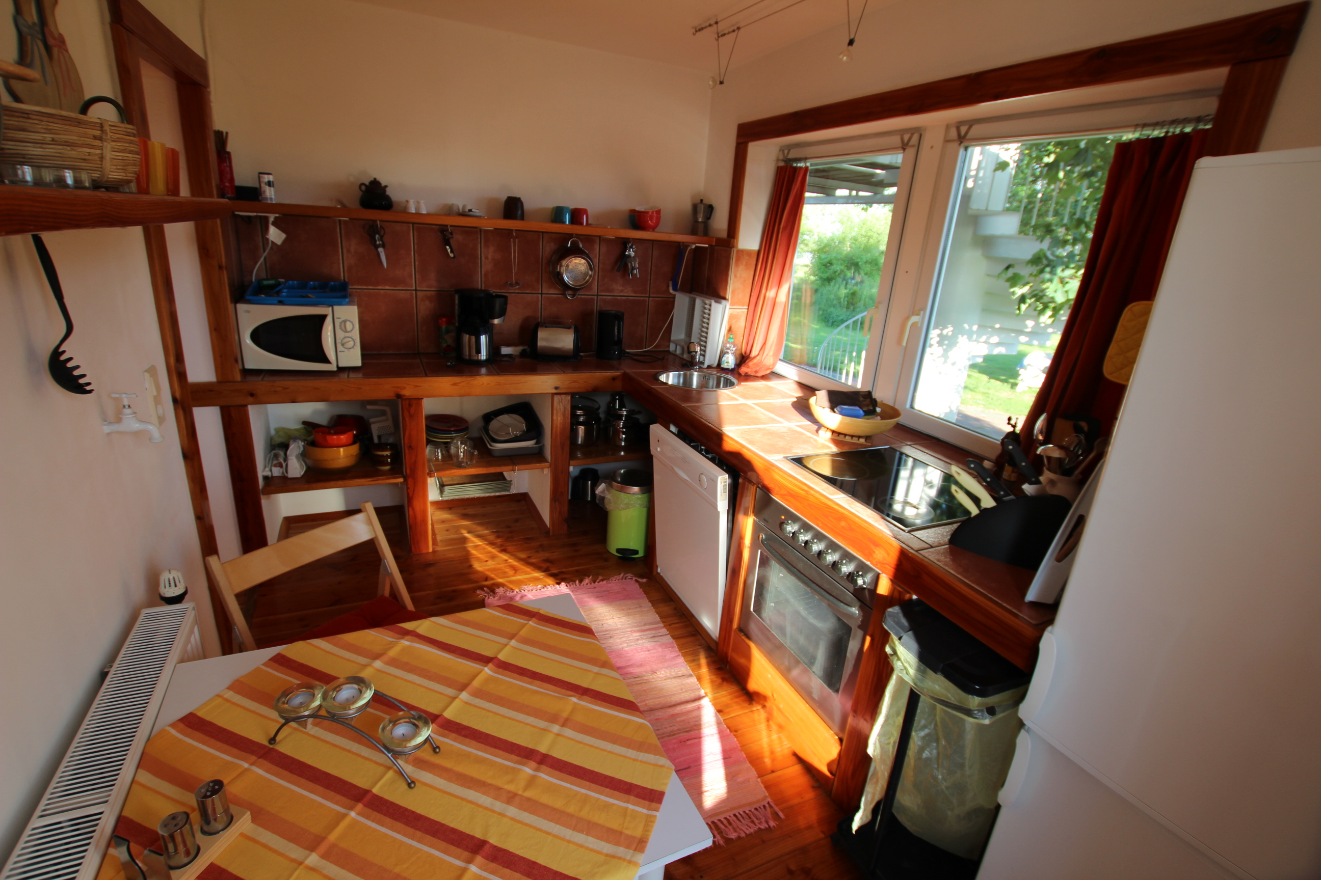 Der Holzdielenboden und das Interieur verleihen ihr einen warmen Charakter. Das Dusch-Bad und die Küche sind mit Terrakottafliesen ausgestattet und haben so einen kuscheliges, mediterranes Flair. Die lichtdurchflutete Küche ist mit Cerankochfeld, Backofen, Mikrowelle, Spülmaschine und Gefrierkombi ausgerüstet. In der Küche befindet sich ein gemütlicher Frühstücksplatz.