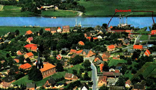 Luftbild von Geversdorf, hinten rechts die Ostewerft |