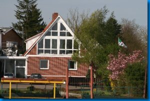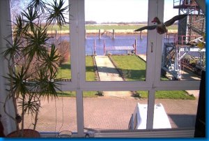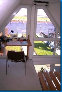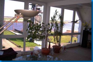 Das Wohnhaus verfügt über ca. 250 qm Grundfläche auf 3 Ebenen. Die Hausfront zum Wasser hin ist vom Giebel bis einschließlich OG komplett verglast. Im Keller, der auch einen Zugang zur verglasten Halle hat, befindet sich eine Werkstatt, eine Sauna mit Vorraum mit Dusche und einem Ruheraum. Im Erdgeschoss befinden sich eine Toilette und 4,5 Zimmer, die bis auf den Fitnessraum, der einen direkten Zugang zur Halle hat, von uns privat genutzt werden. Im Obergeschoß gibt es ein Bad, eine Küche mit Zugang zur Terrasse und Durchreiche, einen Ess- und Wohnraum mit Blick auf die Flusslandschaft. Von der Küche aus hat man Zugang zu den Dachterrassen. Vom Esszimmer führt eine Tangotreppe ins Dachgeschoss, der von uns als Schlafzimmer mit Wasserblick genutzt wird.